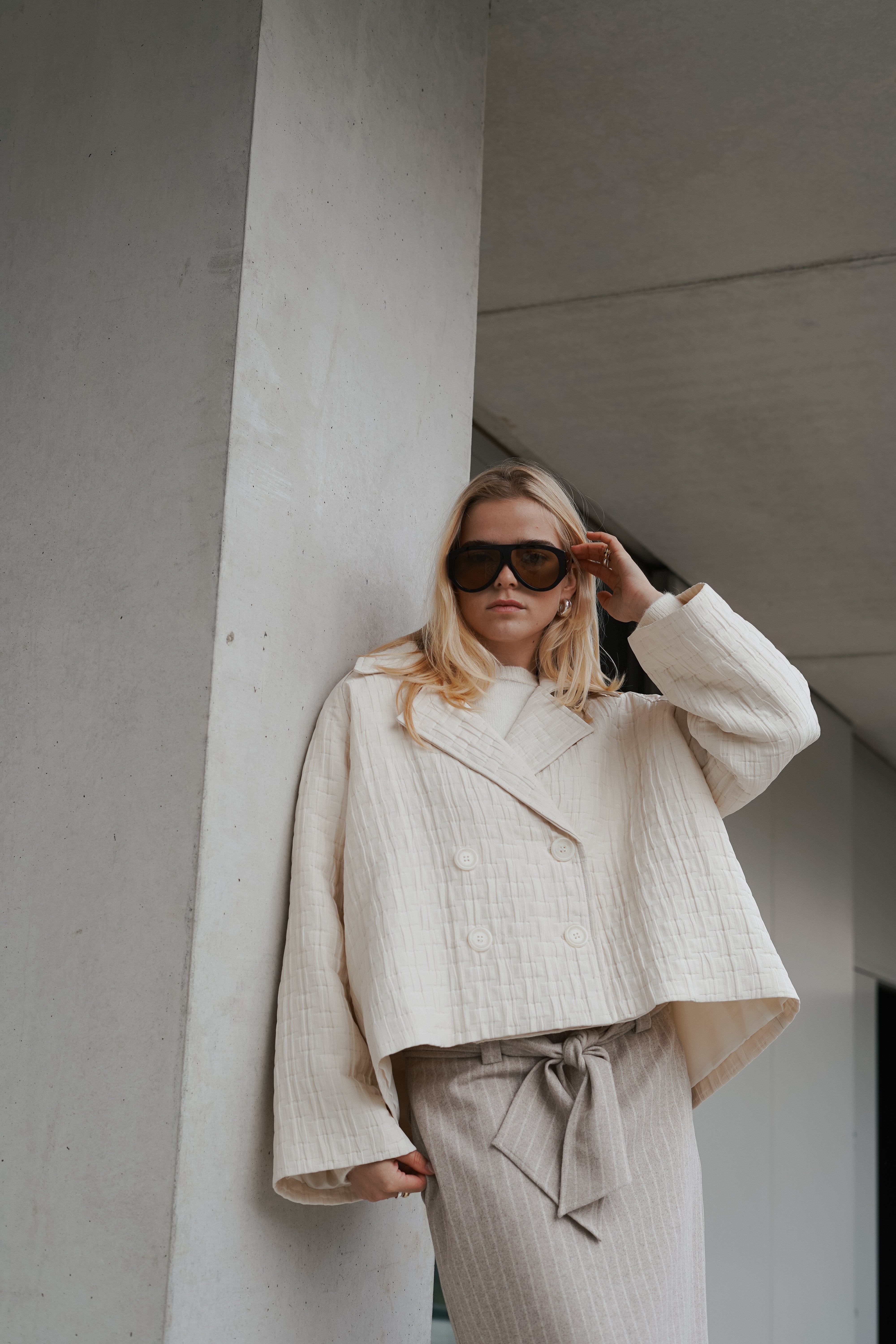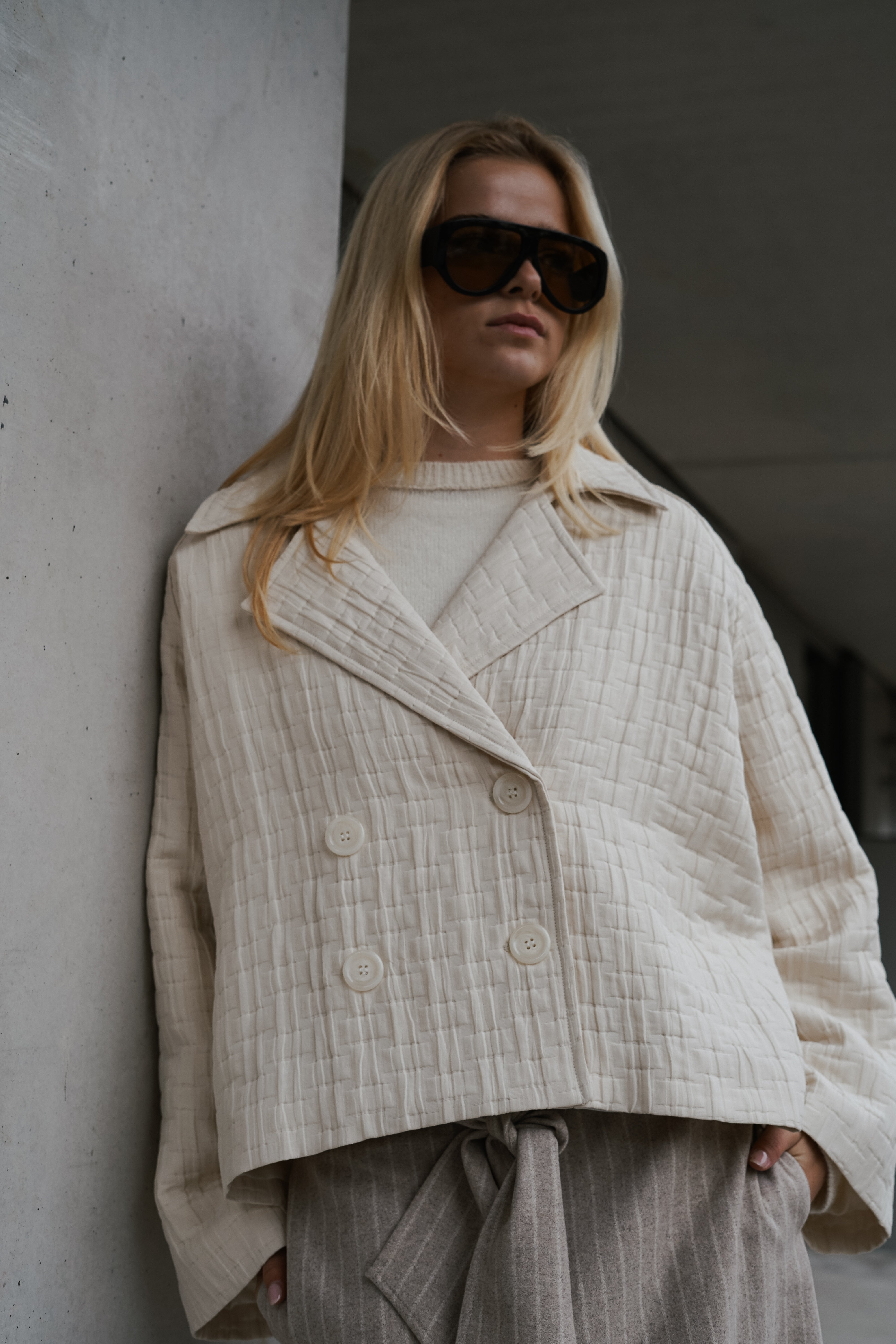 BOBBIE is a boxy double-breasted jacket, crafted from a beautiful textured fabric. Featuring wide sleeves, a relaxed fit, and a structured collar, it offers a modern, effortless silhouette perfect for layering.