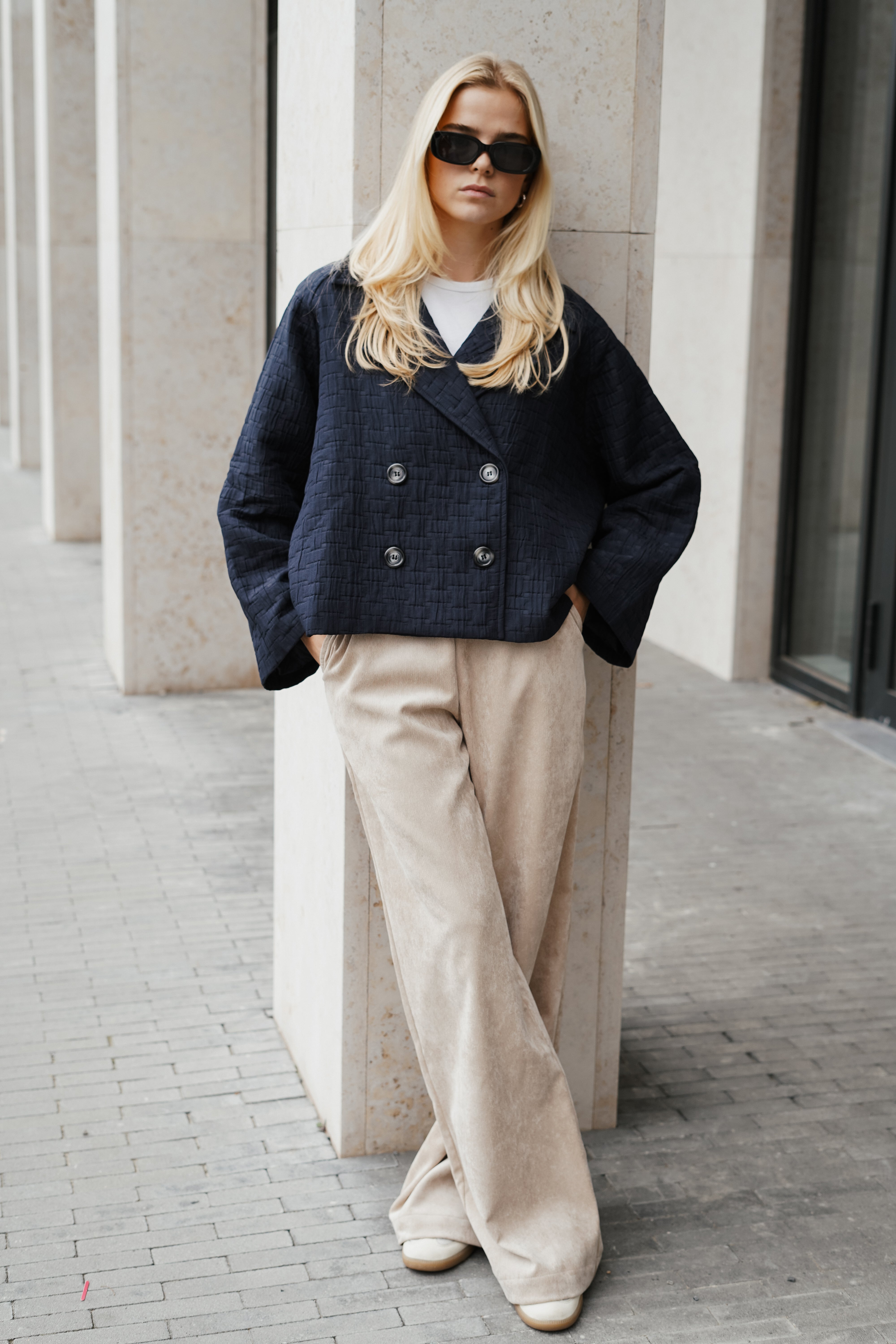 BOBBIE is a boxy double-breasted jacket, crafted from a beautiful textured fabric. Featuring wide sleeves, a relaxed fit, and a structured collar, it offers a modern, effortless silhouette perfect for layering. Available in one size (TU) Our model is 1m80. Composition: 98% Polyester, 2% Elastane
