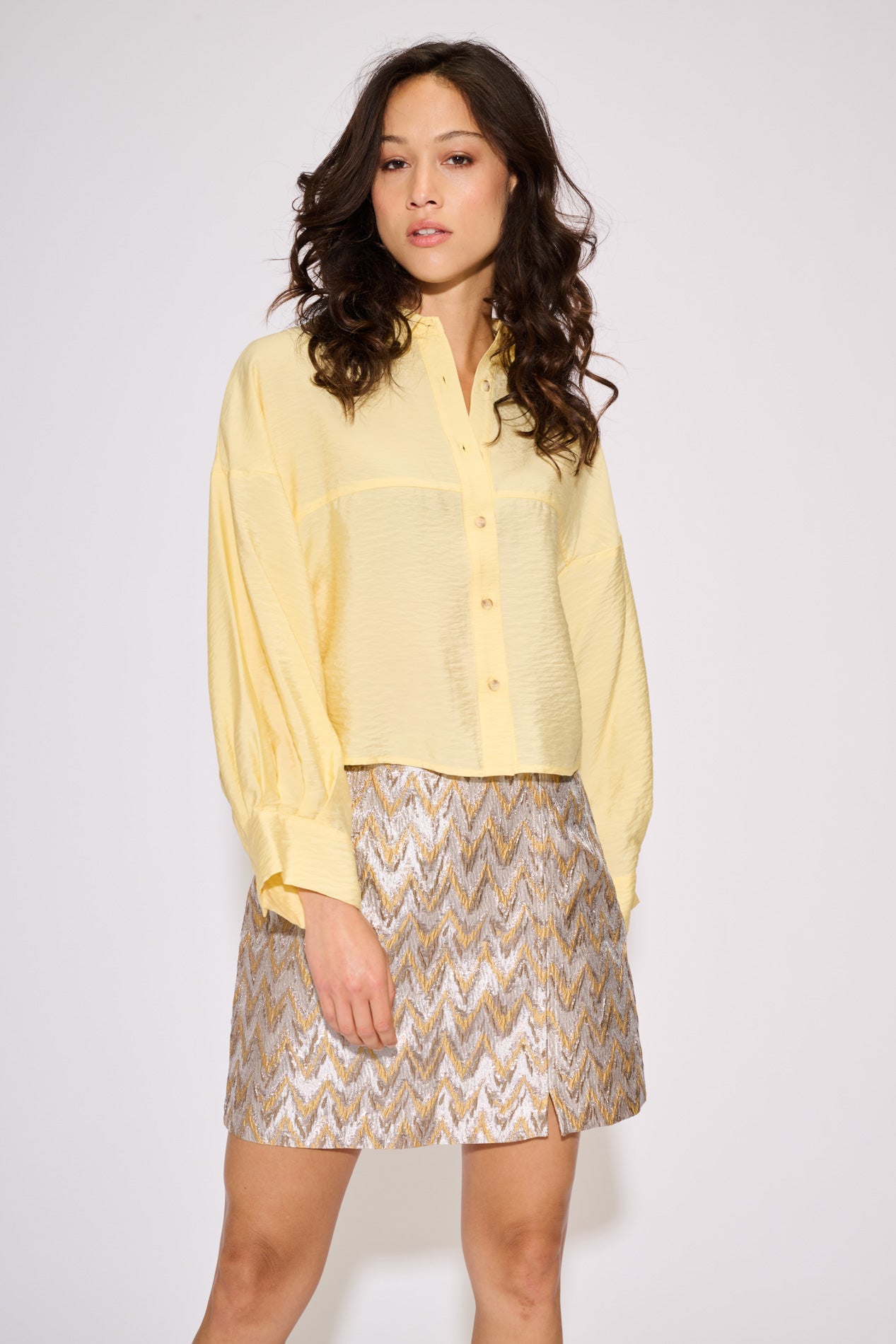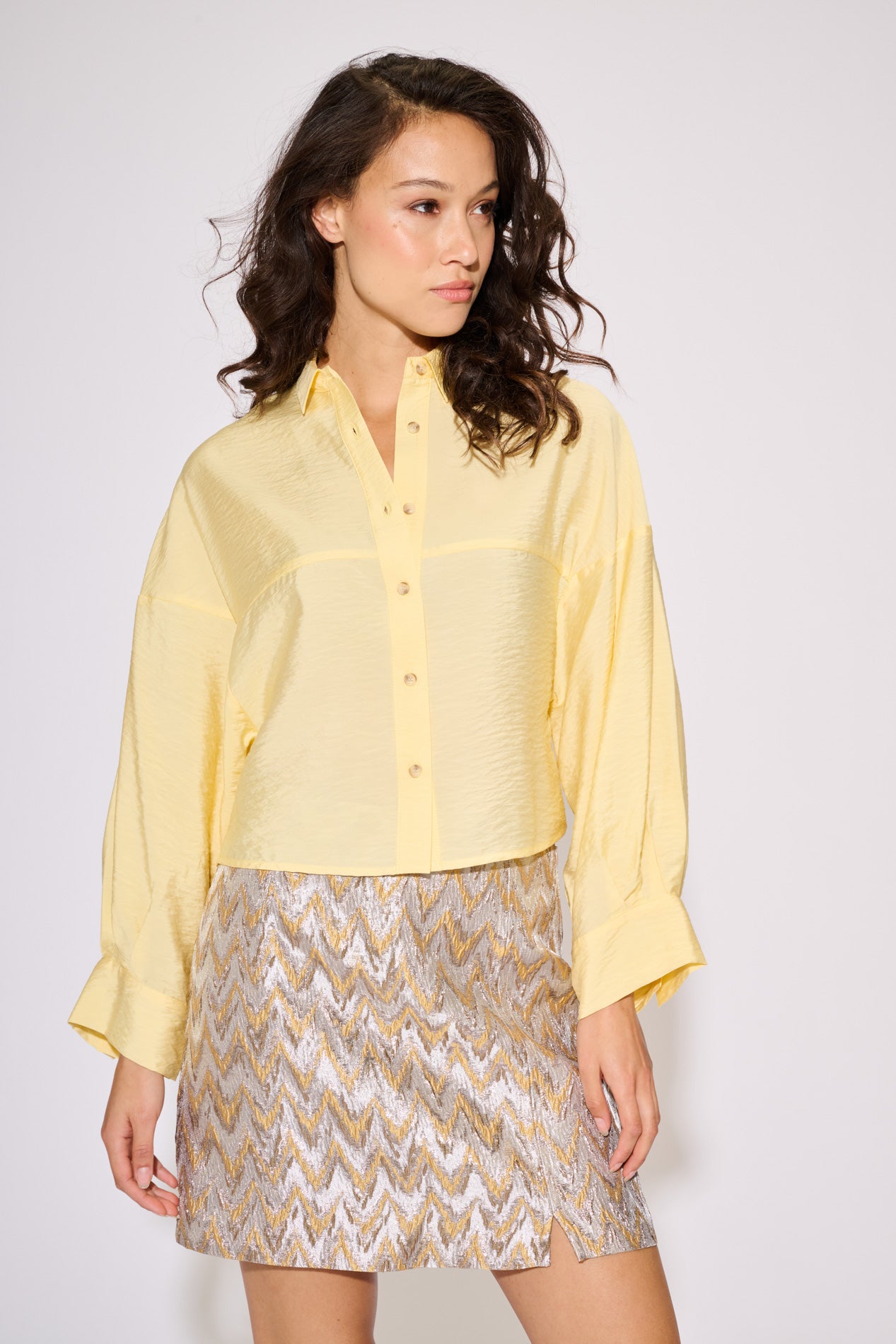 This crisp blouse is crafted from a lightweight fabric for a clean, modern look. Designed with a classic collar and button-down front, it features a relaxed, slightly cropped silhouette and softly voluminous sleeves with cuffed hems. A gently structured yoke adds definition. The model is wearing size S.